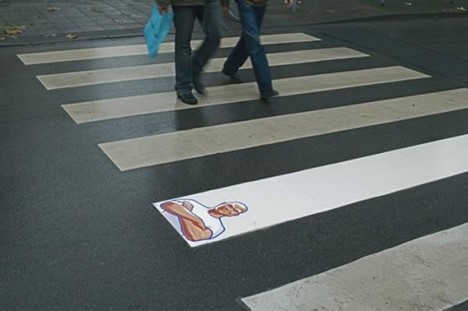 No text. No special offer. Just a single crosswalk stripe painted a brighter shade of white with the iconic character.